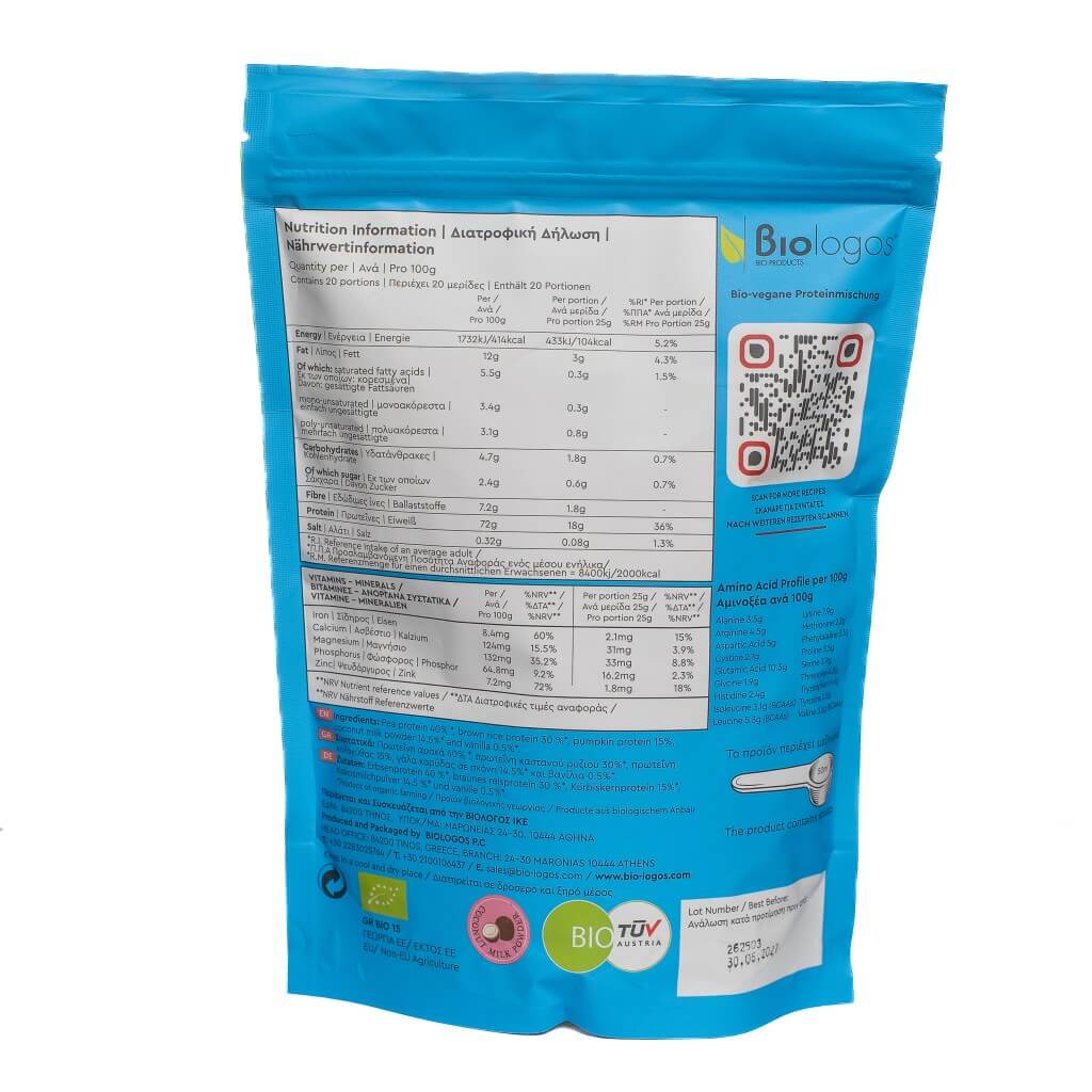 Το Βιολογικό Μείγμα Πρωτεϊνών «Βιολόγος» με 72% περιεκτικότητα σε φυτική πρωτεΐνη από αρακά, καστανό ρύζι και κολοκύθα, εμπλουτισμένο με καρύδα και βανίλια, αποτελεί ιδανική επιλογή για ισορροπημένη vegan διατροφή. Χωρίς γλουτένη, σόγια, λακτόζη ή πρόσθετα γλυκαντικά και με πλήρες προφίλ αμινοξέων, καλύπτει τις ανάγκες όσων ακολουθούν υγιεινό τρόπο ζωής ή έχουν διατροφικές ευαισθησίες. Βραβευμένο για την ποιότητα και τη γεύση του, ενσωματώνεται εύκολα σε smoothies και ροφήματα.