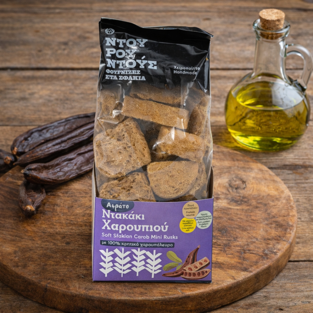 Αφράτο Ντακάκι Χαρουπιού, με 100% κρητικό χαρουπάλευρο. Μπορεί να καταναλωθεί εύκολα, τόσο από παιδιά, όσο και από ηλικιωμένους. Ιδανικό για να αντικαταστήσετε τη φρυγανιά σας στο πρωινό.