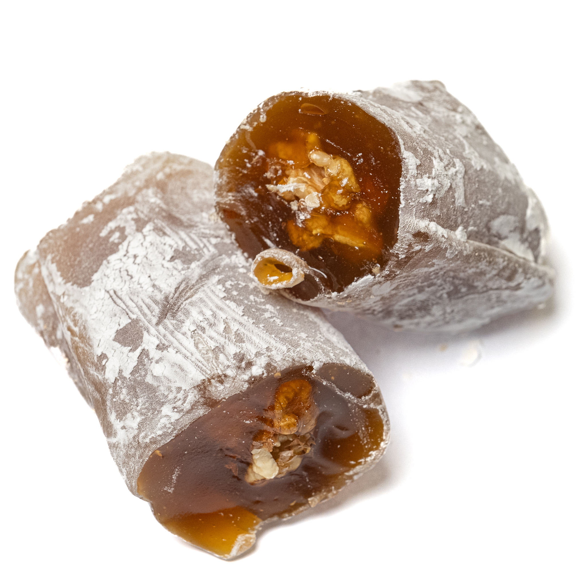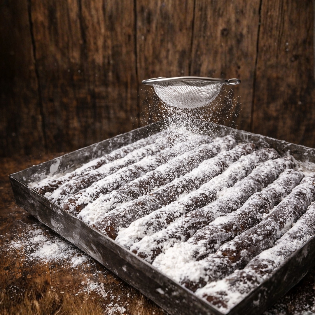 Το κλασικό σουτζούκ λουκούμ με άχνη ζάχαρη ξεχωρίζει για τη μαστιχωτή, γεμάτη υφή του και τη γλυκιά, μελωμένη γεύση του, εμπλουτισμένη με τραγανό ξηρό καρπό στο εσωτερικό. Η απαλή επικάλυψη άχνης ζάχαρης ισορροπεί τη γλυκύτητα και προσφέρει βελούδινη αίσθηση σε κάθε μπουκιά.