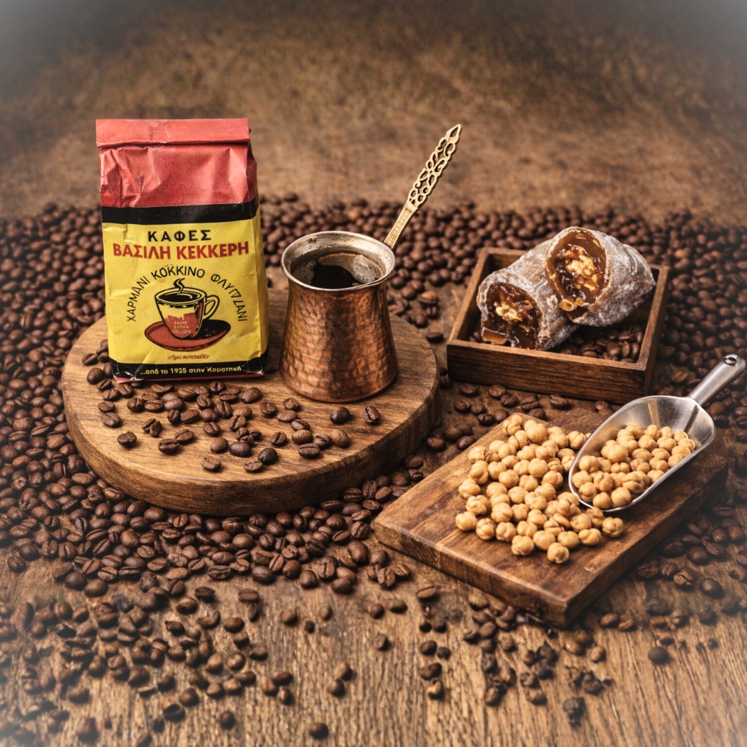 Ο ελληνικός καφές Κέκκερη με τη δική του ιστορία ετών, συμπληρώνει ιδανικά τη γλυκιά ένταση του λουκουμιού. Με πλούσιο άρωμα, γεμάτο σώμα και παραδοσιακό καβούρδισμα, προσφέρει ισορροπημένη γεύση με διακριτική οξύτητα και χαρακτηριστικό καϊμάκι, δημιουργώντας μια αυθεντική εμπειρία ελληνικού καφενείου.