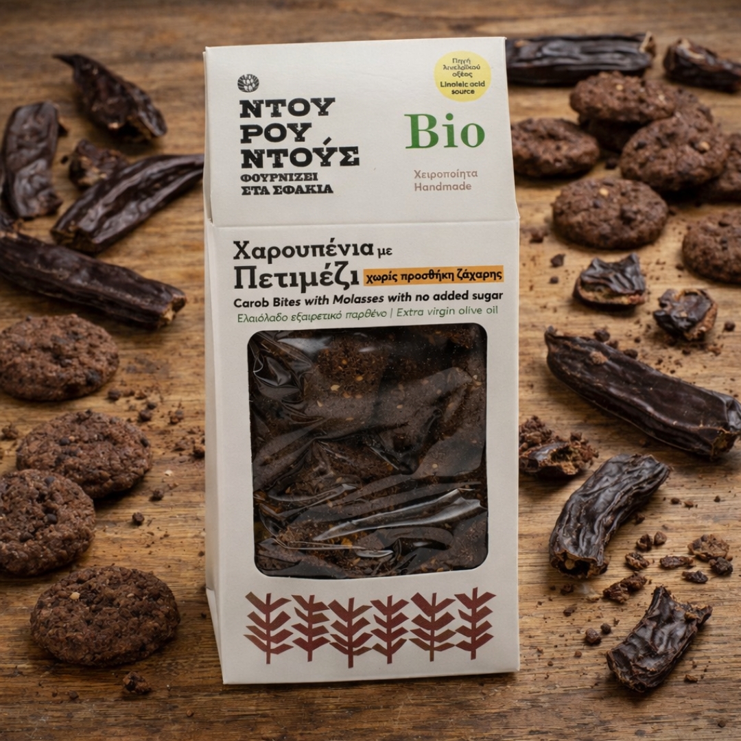 Χαρουπένιες Μπουκιές με Πετιμέζι, χωρίς προσθήκη ζάχαρης, από χαρουπάλευρο (5%), αλεύρι, χαρουπόμελο (11%), πετιμέζι (3%), χυμό πορτοκαλιού, σουσάμι, αμύγδαλα, σταφίδες και έξτρα παρθένο ελαιόλαδο.
