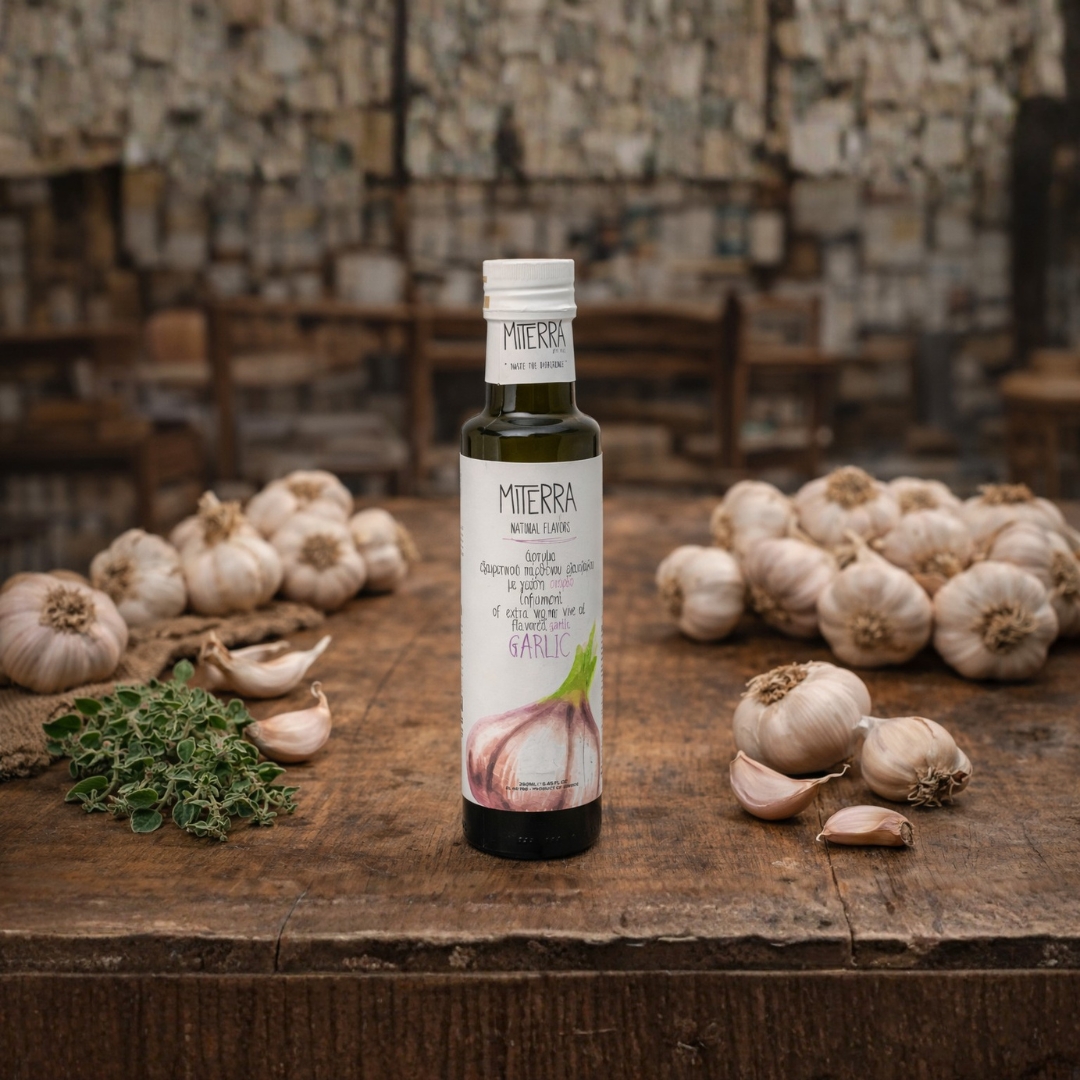 Το εξαιρετικό παρθένο ελαιόλαδο με σκόρδο Miterra Γη μου έχει αυθεντική, χαρακτηριστική γεύση με μοναδικό άρωμα φρέσκιας ελιάς και σκόρδου. Κάθε χρόνο από τον Νόεμβριο μέχρι το Δεκέμβριο οι καρποί συλλέγονται από ελαιώνες στην περιοχή της Βιάννου, νότια της Κρήτης. Το εξαιρετικό παρθένο ελαιόλαδο με σκόρδο Miterra Γη μου περιέχει ψιλοκομμένες φρέσκο-αποξηραμένες σκελίδες σκόρδου. Ιδανικό για να εμπλουτίσετε τις σαλάτες και τα γεύματα σας με φυσικά αρώματα και γεύσεις. Δοκιμάστε το ελαιόλαδο με σκόρδο σε ζυμαρικά, ριζότο, στο τζατζίκι, σάλτσες ντομάτας και ντρέσινγκ, ψητά λαχανικά. Είναι ιδανική επιλογή για όσους θέλουν ένα γευστικό, αγνό ελαιόλαδο υψηλής ποιότητας και διατροφικής αξίας.