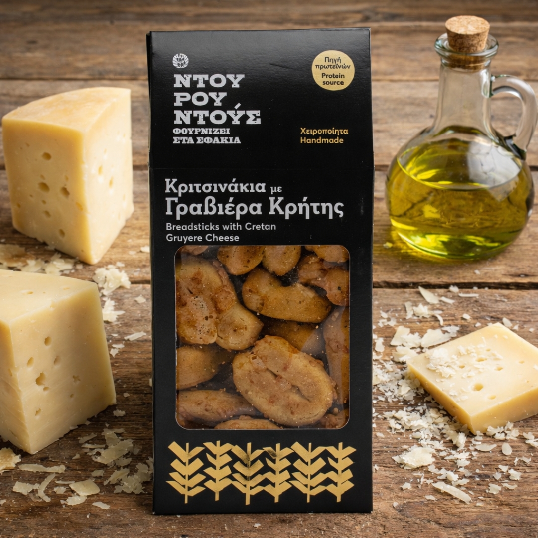 Κριτσινάκια με Γραβιέρα Κρήτης, πλούσια σε πρωτεΐνες από εκλεκτό αιγοπρόβειο γάλα. Περιέχουν αλεύρι, καλαμποκάλευρο, λευκό κρασί, αλάτι, ρίγανη, μαγιά και μαύρο σουσάμι.