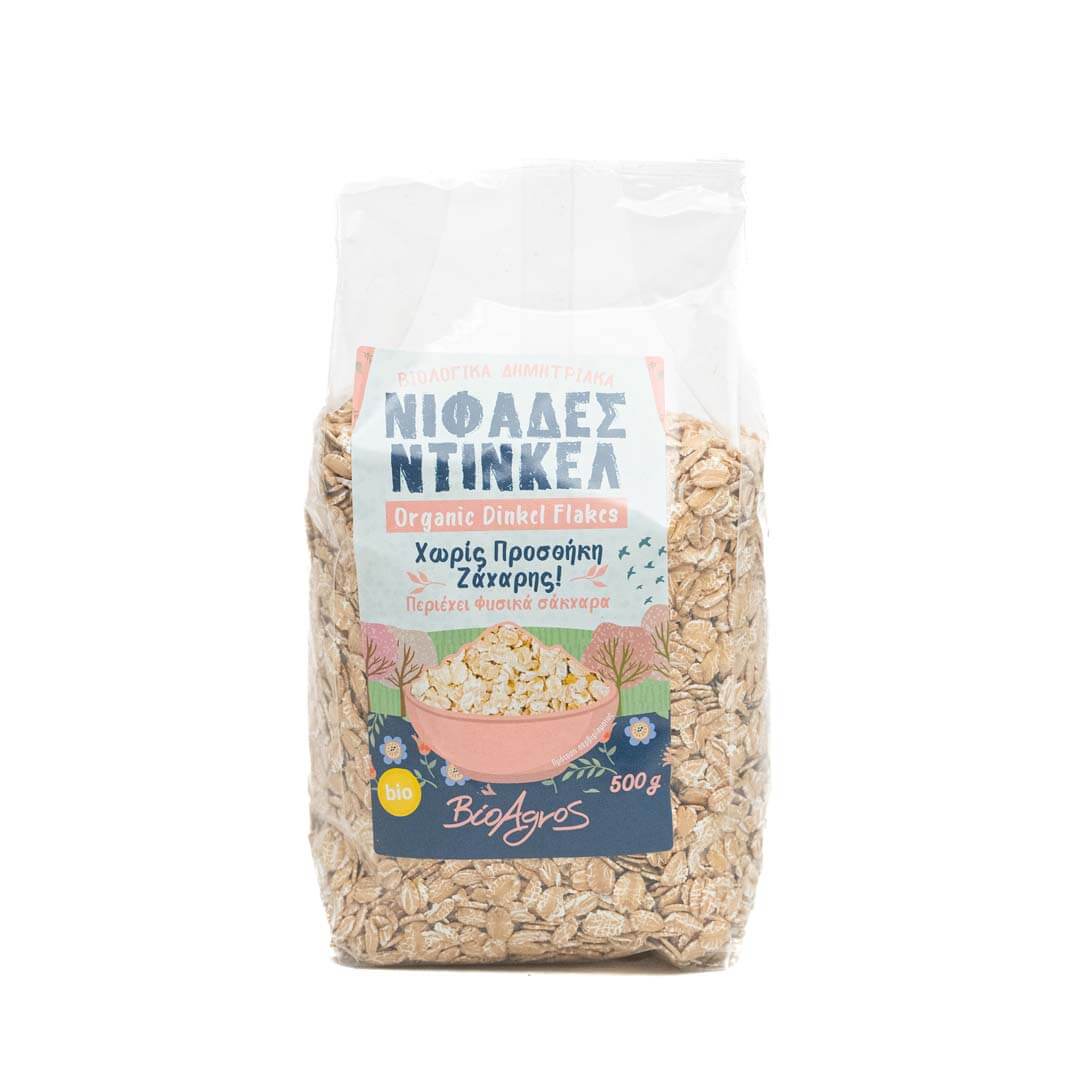 Οι νιφάδες ντίνκελ (Dinkel) – αποτελούν προϊόν επεξεργασίας του αρχαίου δημητριακού που έχει μεγάλη συγγένεια με το γνωστό μας σιτάρι. Η διαφορά του είναι ότι το ντίνκελ είναι πιο εύπεπτο και θα μπορούσε να αποτελέσει υπό προϋποθέσεις κατάλληλη διατροφή σε άτομα με δυσανεξίες π.χ. στη γλουτένη. Η γλουτένη που περιέχει είναι διαφορετικής σύστασης με το κοινό σιτάρι. Περιέχει πολλές πρωτεΐνες, μεγάλο ποσοστό σιδήρου, ψευδαργύρου και μαγνησίου καθώς και τις βιταμίνες Β1 και Β2. Επίσης είναι πηγή πολλών θρεπτικών ινών. Οι νιφάδες ντίνκελ είναι ιδανικές για πρωινό, στο γιαούρτι ή στο γάλα όπως επίσης για κρέμες γλυκά, και κέικ.
