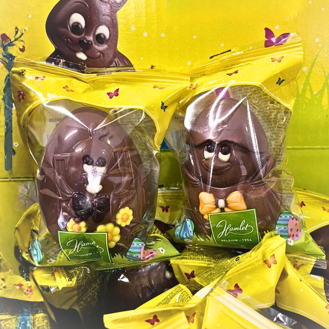 Χαριτωμένη πασχαλινή σοκολατένια φιγούρα με παιχνιδιάρικο πρόσωπο και διακοσμητικό φιόγκο, που χαρίζει γιορτινή διάθεση και γλυκιά απόλαυση σε κάθε μπουκιά. Ένα όμορφο και πρωτότυπο κέρασμα για το πασχαλινό τραπέζι, ιδανικό για πασχαλινά καλάθια, δωράκια και γιορτινά κεράσματα για μικρούς και μεγάλους.