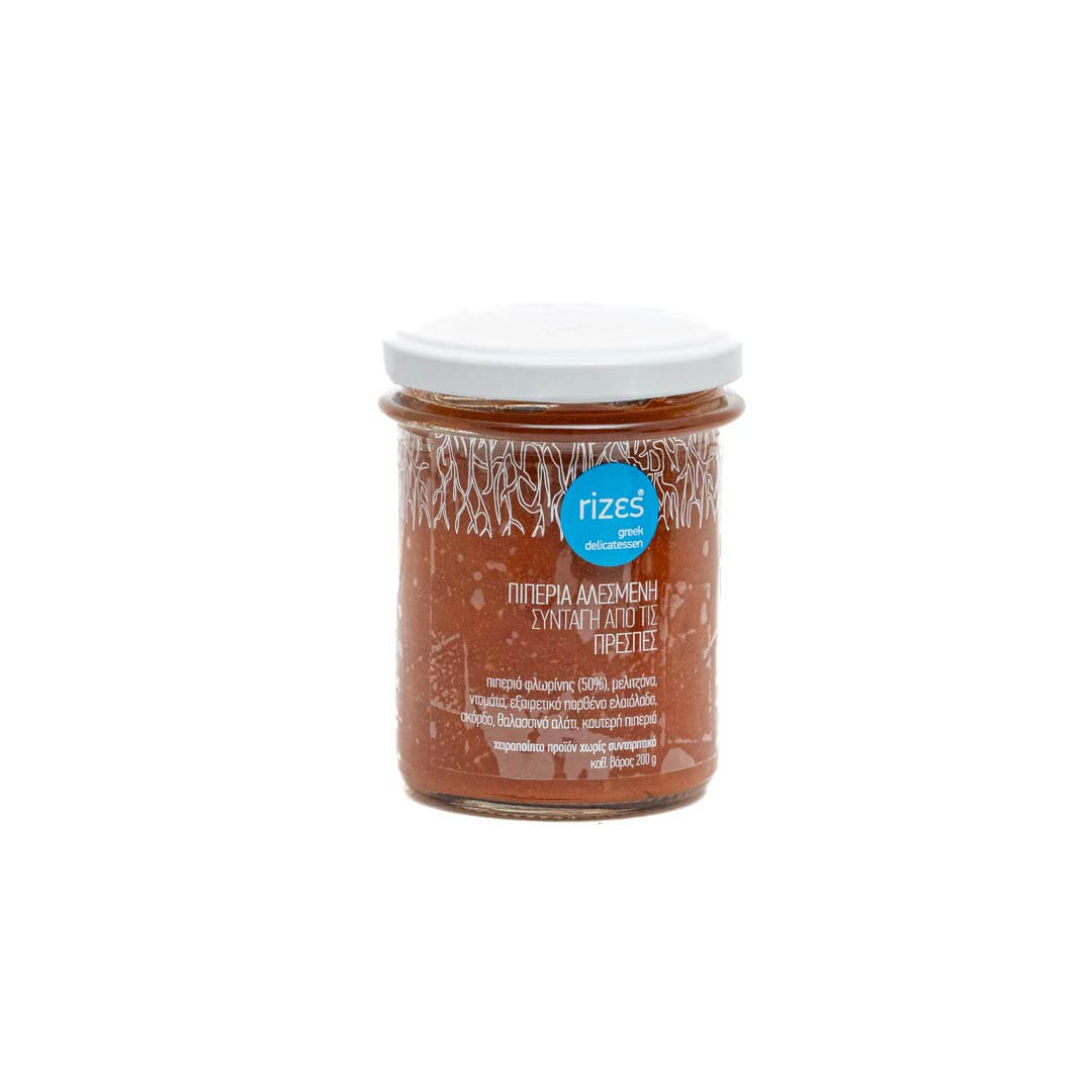 Οι πιπεριές Φλωρίνης σιγοβράζουν με ψημένες στα κάρβουνα μελιτζάνες, πολτό από φρέσκιες ντομάτες σε εξαιρετικό παρθένο ελαιόλαδο, σκόρδο και λίγη καυτερή πιπεριά. Είναι μία πυκνόρρευστη σάλτσα με πραγματική γεύση τοπικής παραδοσιακής κουζίνας, στην οποία η καπνιστή γεύση της πιπεριάς και της μελιτζάνας με τη ντομάτα και το σκόρδο ταιριάζουν απόλυτα.