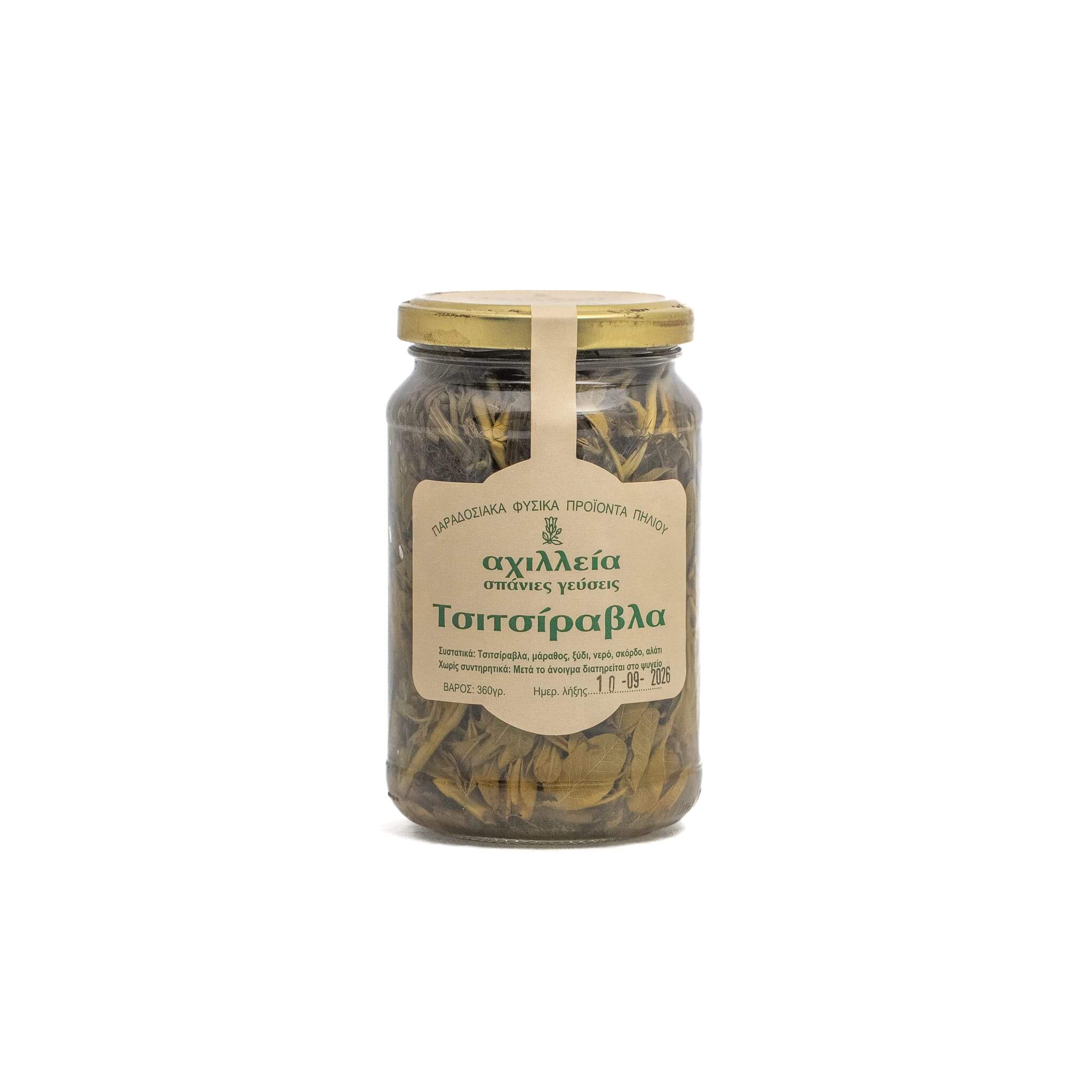 Τσιτσίραβλα ή τσιτσίραβα. Ο ιδανικός πηλιορείτικος τσιπουρομεζές! Τουρσί με ξύδι, σκόρδο, άλμη και προσθήκη μάραθου. Αποτελεί πολυαγαπημένο ορεκτικό για όσους το γνωρίζουν! Πρόκειται για το νεαρό φύλλο αγριοφυστικιάς (Τερέβινθος), το οποίο συλλέγεται στις αρχικές φάσεις της ανθοφορίας του, καθώς μόνο τότε είναι βρώσιμο, κατόπιν σκληραίνει.