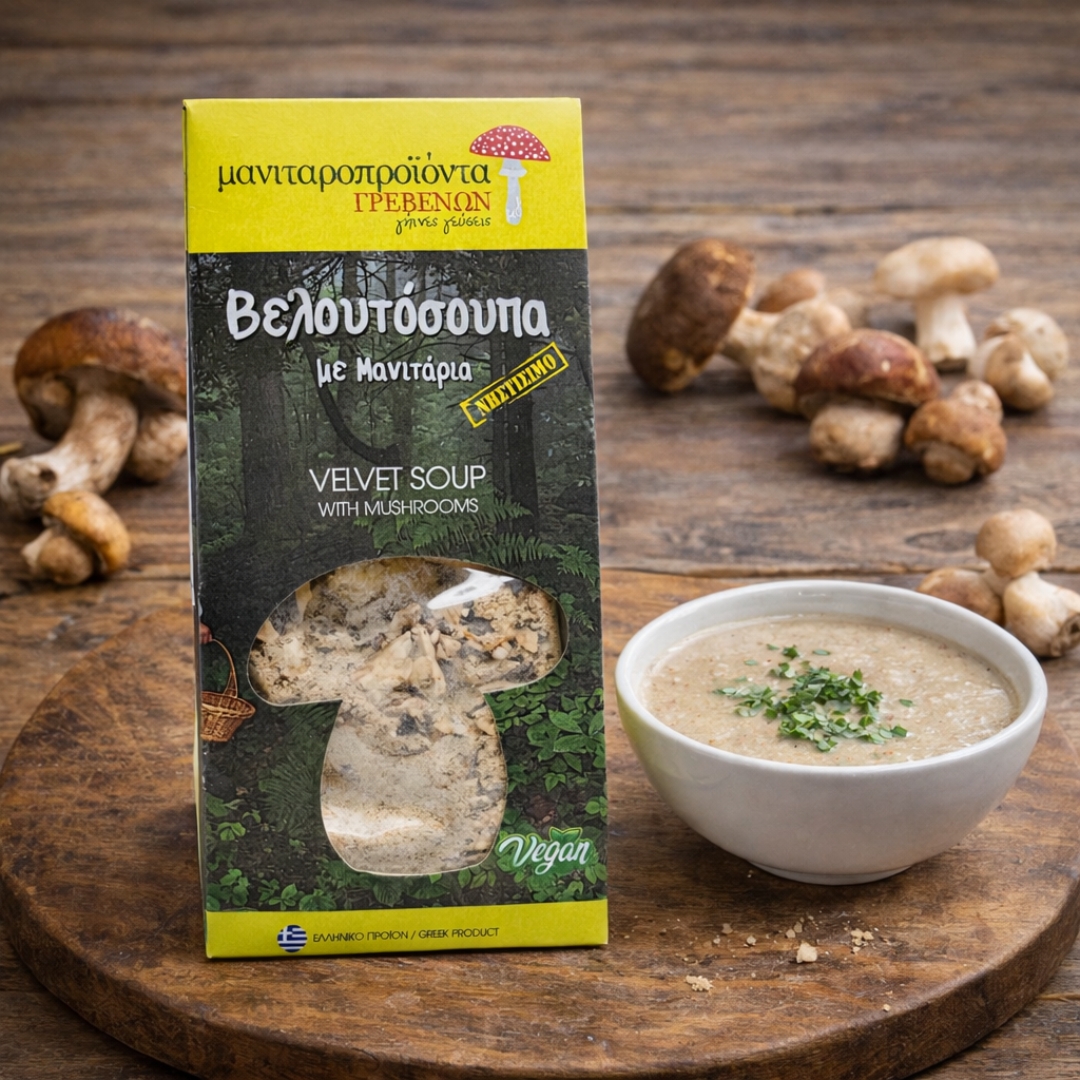 Μία εύκολη, γρήγορη και υγιεινή επιλογή, βελουτόσουπα με μανιτάρια. Η κάθε συσκευασία είναι περίπου 10 μερίδες και χρειάζεται 10 λεπτά για να γίνει. Περιέχει 100% άλευρα και σιτηρά από τα Γρεβενά, μανιτάρια αφυδατωμένα Βωλίτη και Αγαρικό, αφυδατωμένα λαχανικά, πουρέ πατάτας και μίγμα μπαχαρικών.